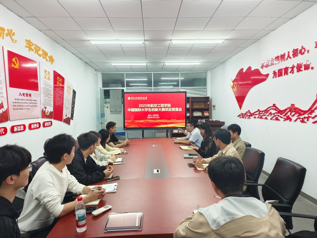 为系统总结参赛经验,精准部署未来工作,2025年10月16日晚,航空工程学院在G4-227召开学院2025年中国国际大学生创新大赛项目复盘会。学院党委书记李晓雯、副院长张建鹏、学工办主任梅皓天及各参赛项目指导老师及学生核心成员共同参会。