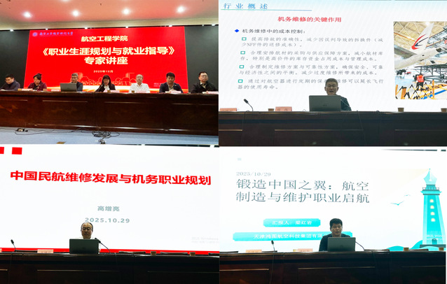 为深入落实《职业生涯规划与就业指导》课程教学要求,帮助2025级新生更好地了解航空行业,明确职业发展方向,10月29日晚,航空工程学院特邀三位航空领域资深专家,分别是来自东方航空技术江苏分公司副总经理项伟、中国邮政航空南京分公司副总经理高增亮、天津鸿图航空技术集团有限公司副总经理梁红岩,在交流中心二楼报告厅开展2025级新生职业生涯规划与就业指导系列专题讲座。学院领导班子成员、教师代表和2025级飞行器维修工程技术专业、航空智能制造技术专业、航空动力装置维修技术专业全体新生参加了本次讲座,讲座由学院党委书记李晓雯主持。
