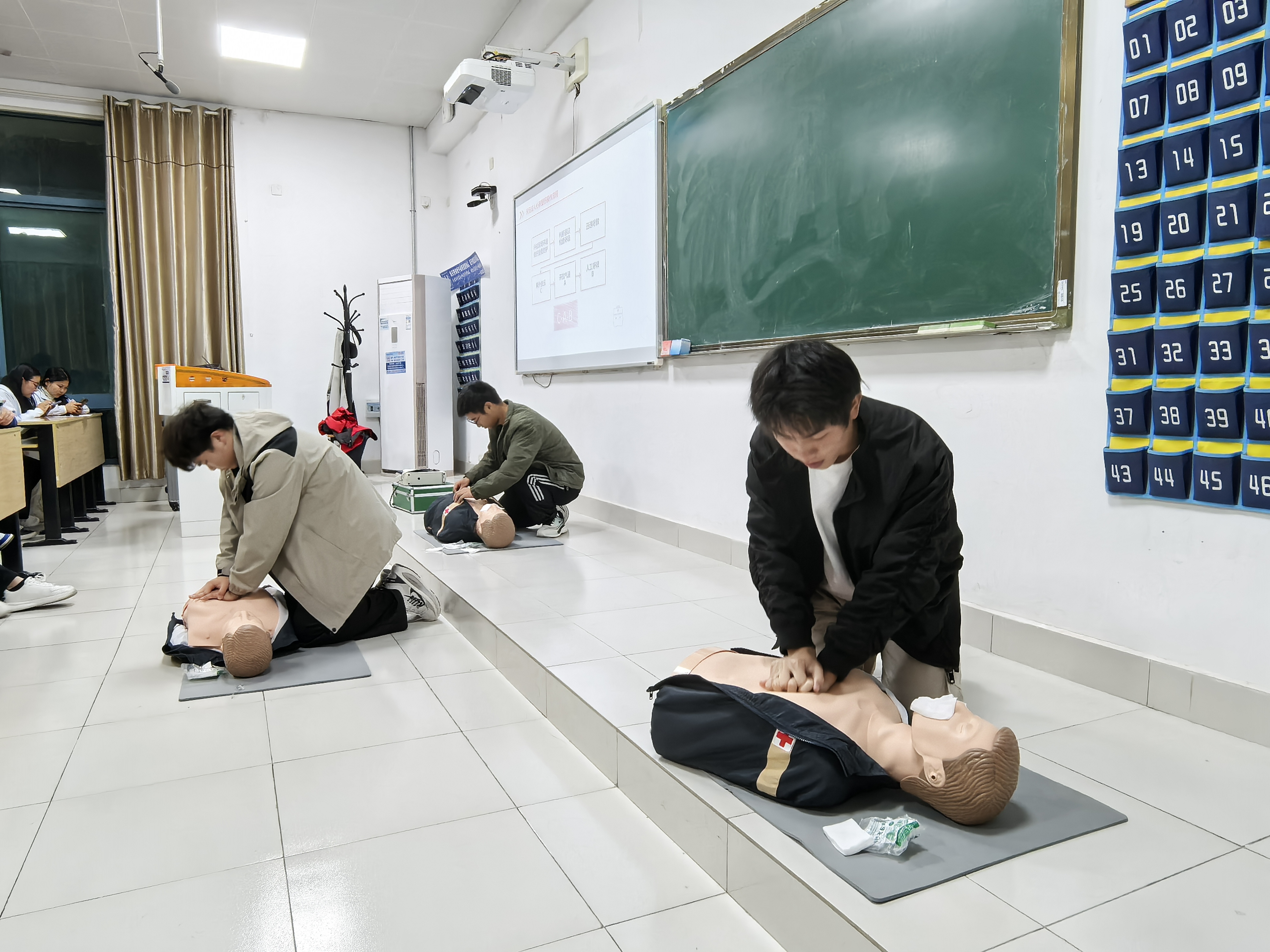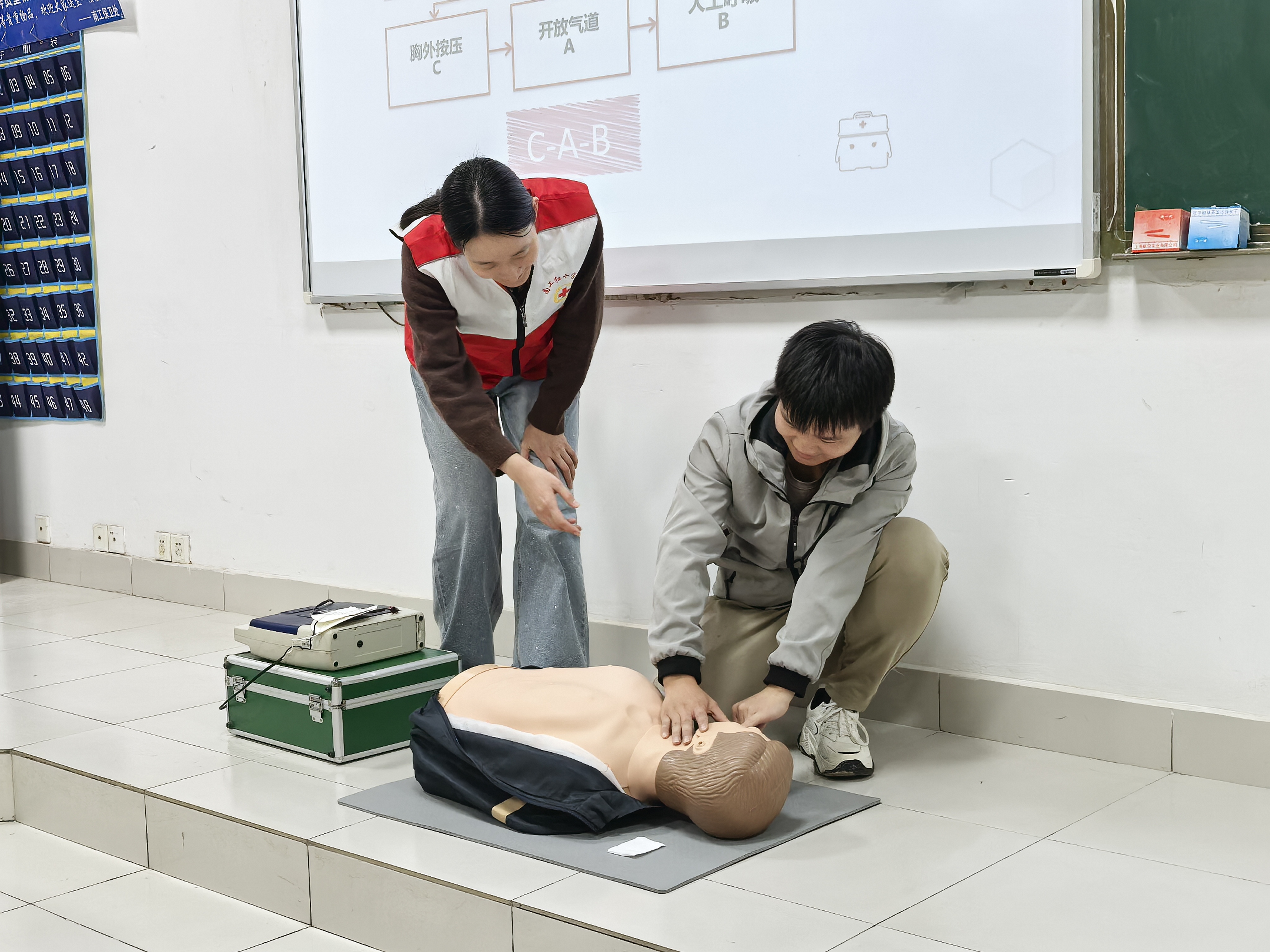 培训中,仇洪红以她专业而不失生动的语言,系统讲解了心肺复苏(CPR)的操作流程、自动体外除颤器(AED)的使用原理以及气道异物梗阻现场施救方法等内容。她特别结合校园生活中可能遇到的一些突发状况,深入浅出地分析了“黄金救援4分钟”的重要性,并逐一演示了胸外按压、开放气道、人工呼吸等关键步骤的操作要点,强调了科学施救与自我保护在应急中的必要性。
