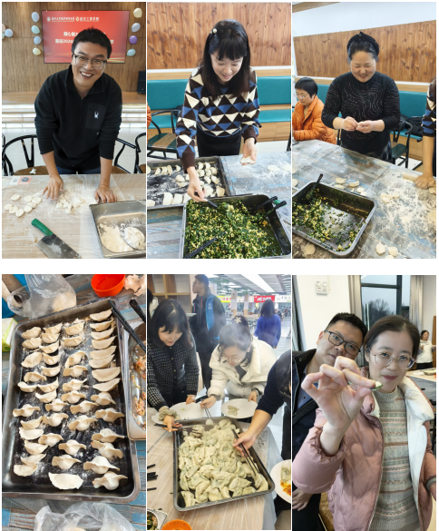 下午三点,活动正式拉开帷幕。教职工们根据包饺子熟练程度自发组成多个小组,迅速投入到热火朝天的“生产”中。和面、擀皮、调馅、包捏......各个环节井然有序。经验丰富的老师手法娴熟,包出的饺子形如元宝;初学者则在“高手”指导下认真模仿,虽然形状各异却创意十足。整个过程中,大家互相交流技巧,分享心得,平日里严谨的学术氛围被温馨的烟火气所取代。