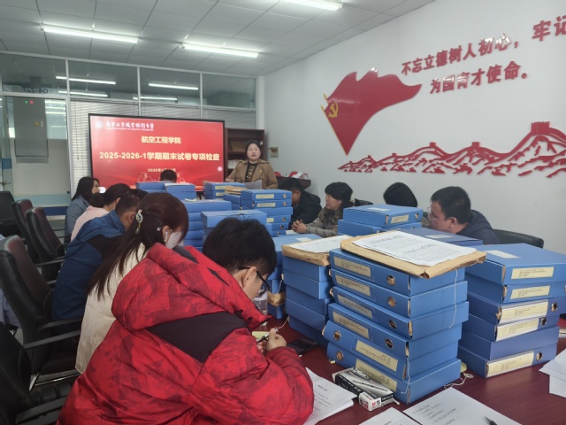 为持续强化教学质量监控,提升教师试卷命题、阅卷及归档工作的规范化水平,全面落实本科专业评估工作要求,扎实推进迎评促建各项工作,3月25日上午,航空工程学院组织开展2025-2026学年第一学期期末试卷专项检查工作。